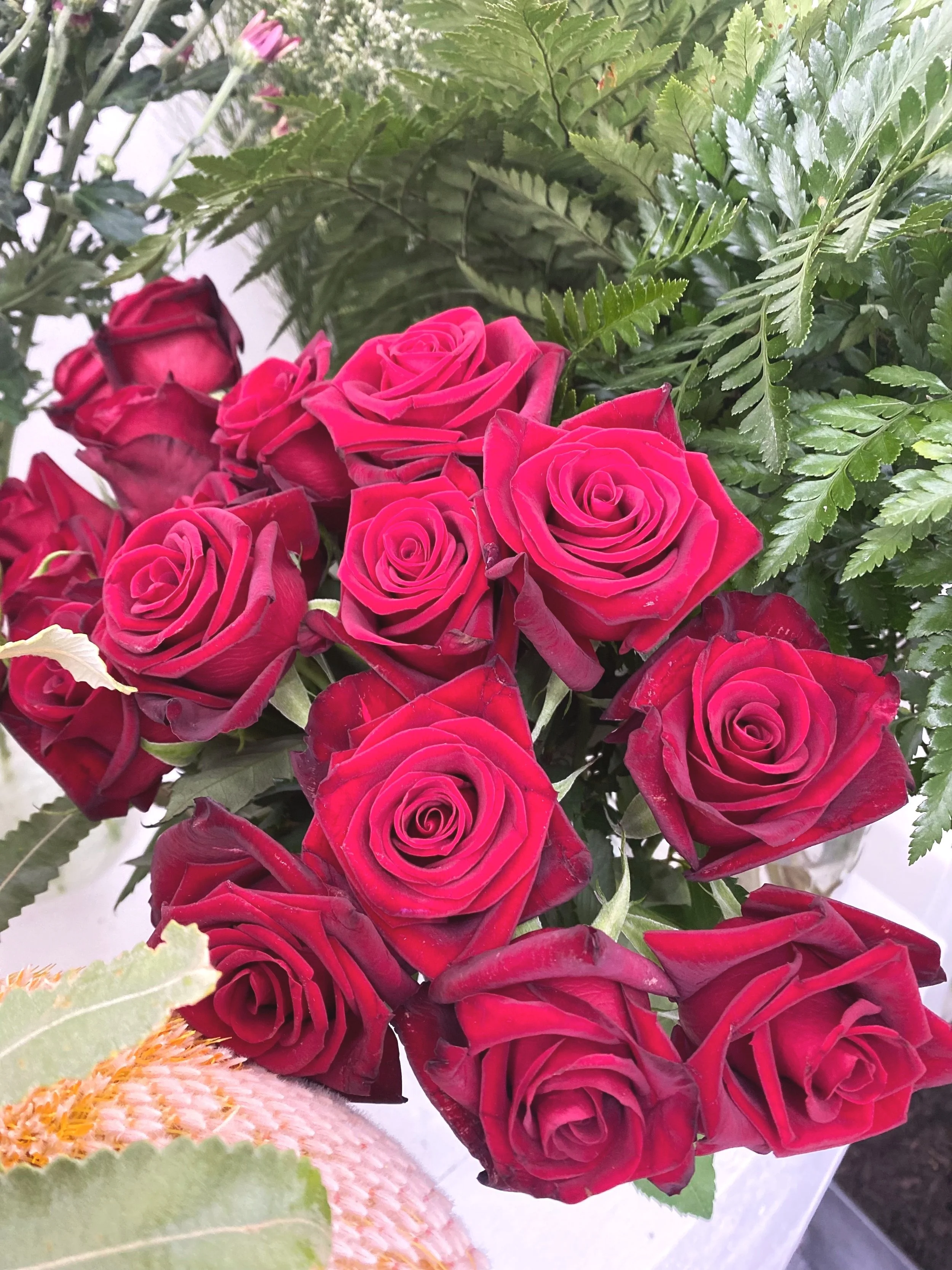 10 stems of fresh Roses, wrapped & ready. Colours may vary.